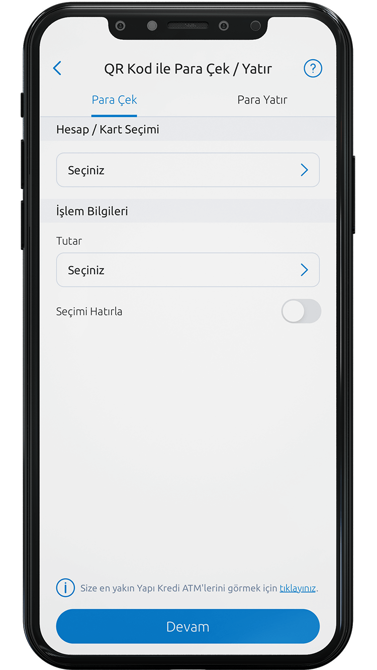Hesabınızdan QR Kod ile para çekmek için; Yapı Kredi Mobil’e giriş yaptıktan sonra anasayfada bulunan “Para Çek/Yatır” butonuna basın. Para çekeceğiniz hesabınızı/kartınızı ve tutarı seçin. ATM ekranındaki QR Kodu, Yapı Kredi Mobil ekranında açılan kameraya okutun ve ATM’den paranızı alın. Dilerseniz, ilk ekranda “Seçimi Hatırla” seçeneğini aktif hale getirerek; bir Devamı